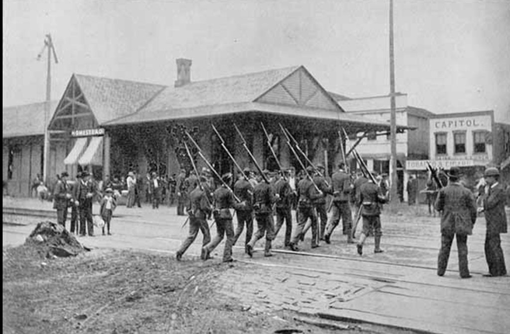 The Homestead Strike, or Battle of Homestead, was a violent labor conflict in 1892 at the Carnegie Steel Company in Homestead, Pennsylvania, triggered by a lockout and a dispute over wages and union recognition. The confrontation escalated into a bloody battle between striking workers and the Pinkerton National Detective Agency, hired by management, resulting in deaths and injuries on both sides. The strike ultimately failed, leading to the defeat of the union and the end of the skilled steelworkers’ union, but it became a pivotal moment in American labor history, highlighting the brutal tactics used by both workers and owners.